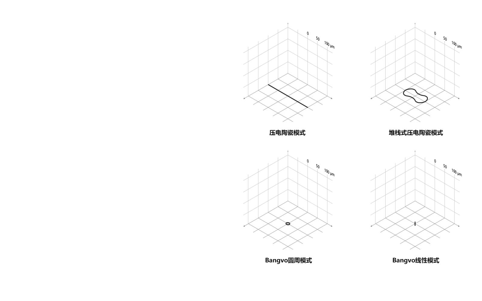 四種不同工作原理的工作尖尖端振蕩和振幅的比較。